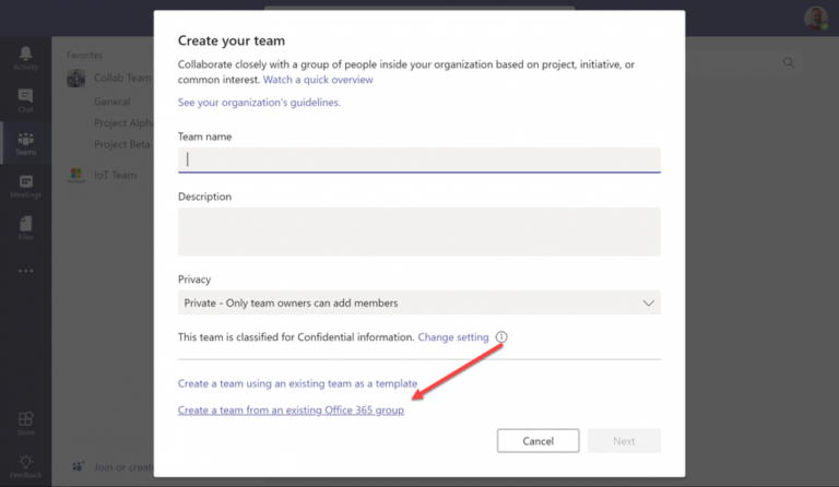 Seguidamente, buscaremos la opción Crear desde un grupo de Office 365 existente.
