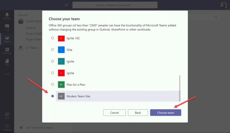 Tan sólo nos quedará seleccionar el grupo de Office 365 al que estará asociado el equipo de Microsoft Teams.